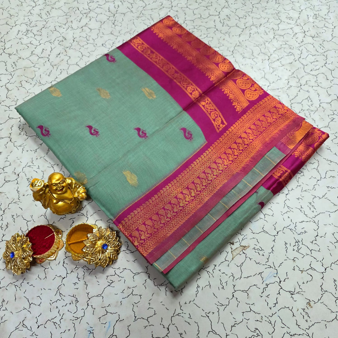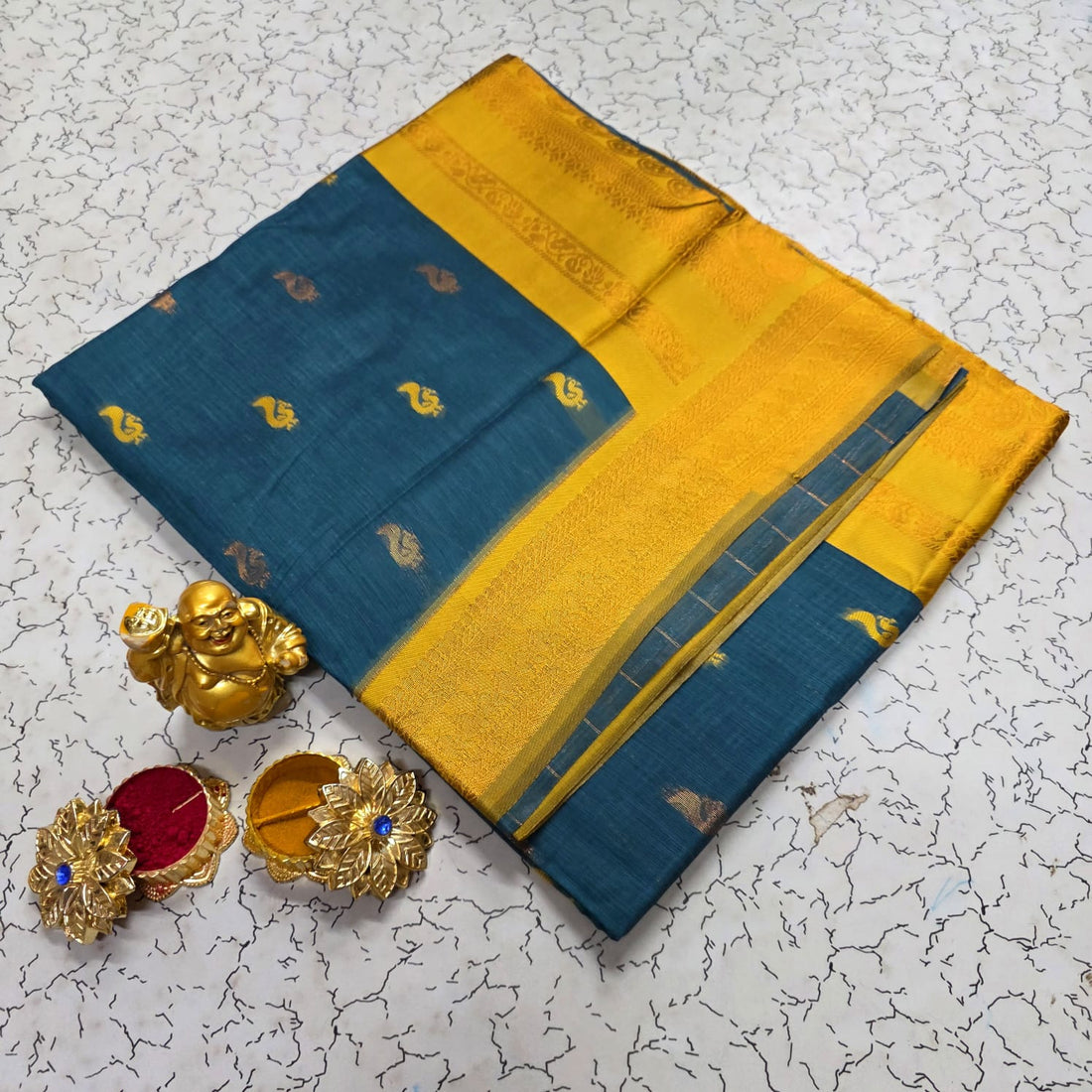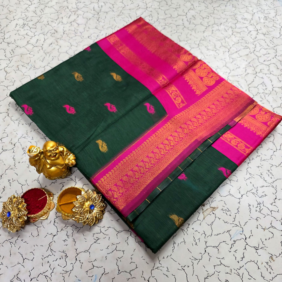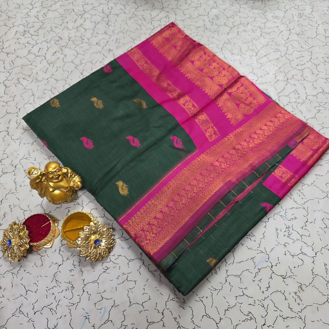 Soft Kalyani silk saree Rich mustard body with contrast border Elegant dark green zari woven...